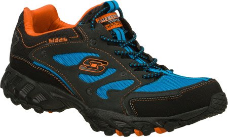 Get caught up in sporty style with the Skechers Spider-Web sneaker. This men's trail shoe features a leather upper for a glove-like fit; a lightly padded collar and tongue ensure comfort and personalized fit. A cushioned footbed with fabric lining keep the interior fresh and comfortable. Synthetic toe and heel bumpers offer additional protection, while the bungee lacing panel offers on/off ease. Stay energized with the shock-absorbing midsole and stable on your feet with the flexible, traction outsole of the Skechers Spider-Web athletic shoe.
