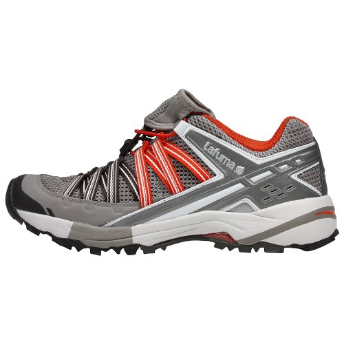Hit the trail running in this sporty, lightweight trail shoe from Lafuma. The Sky Race features a mesh and synthetic upper that's both breathable and supportive. A quick-lacing bungee system lets you adjust the fit--and take off in a hurry. A padded collar, cushioned insole, and shock-absorbing midsole will help keep your foot happy while a rubber-reinforced toe helps prevent injury from stray rocks and trail debris. Its flexible rubber sole offers serious traction and comfort.